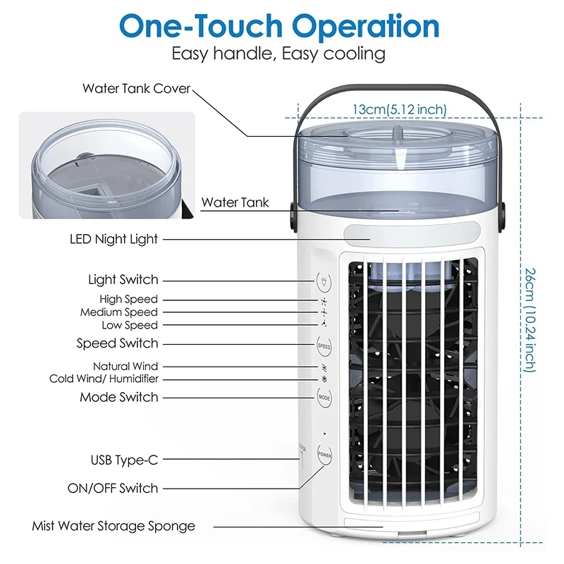 Product Name: Draagbare Airconditioner Ventilator, Persoonlijke Verdampingskoeler Met 3-Speed Wind, Rustige Kleine Air Cooler Desk Misting Ac Fan